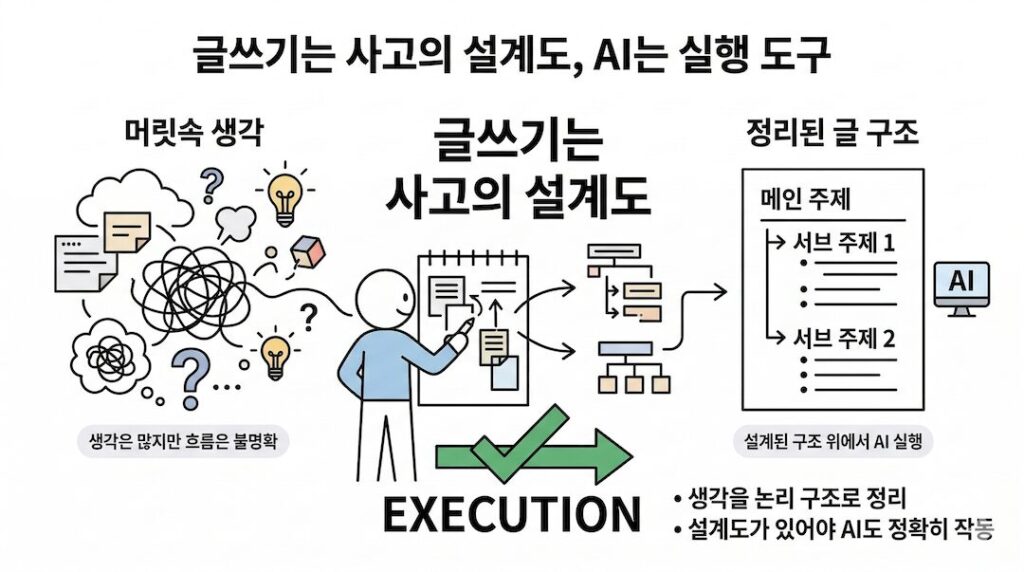 구체적으로는 어떤 요소를 중앙에 둘지, 무엇을 박스로 나눌지, 아이콘은 어디에 둘지, 텍스트는 얼마나 줄일지를 이 단계에서 결정합니다. 예를 들어 “AI 글쓰기 3단계 프로세스”를 이미지로 만든다면, 순서형 구조를 선택하고 각 단계를 번호+박스로 배치하며, 단계 간 화살표로 흐름을 연결하는 방식으로 설계도를 먼저 만듭니다. 이 구조 단계가 없으면 AI는 내용을 장면으로만 처리합니다. 구조 단계가 있으면 AI는 의미가 정리된 레이아웃으로 작업합니다. 같은 원고를 넣어도 결과물의 전달력이 달라지는 이유가 여기에 있습니다.
