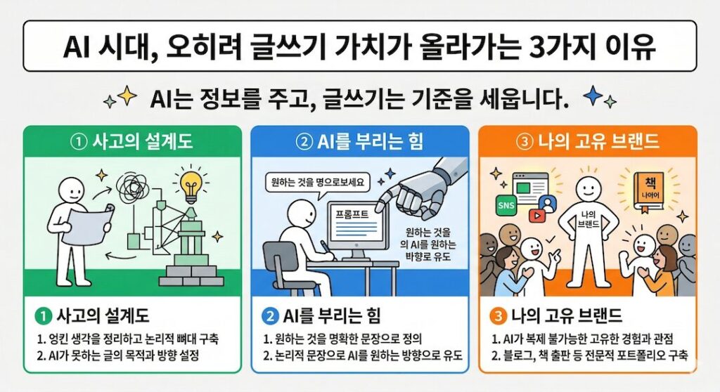 “AI 글쓰기 수정 설계 3단계를 나타낸 인포그래픽.