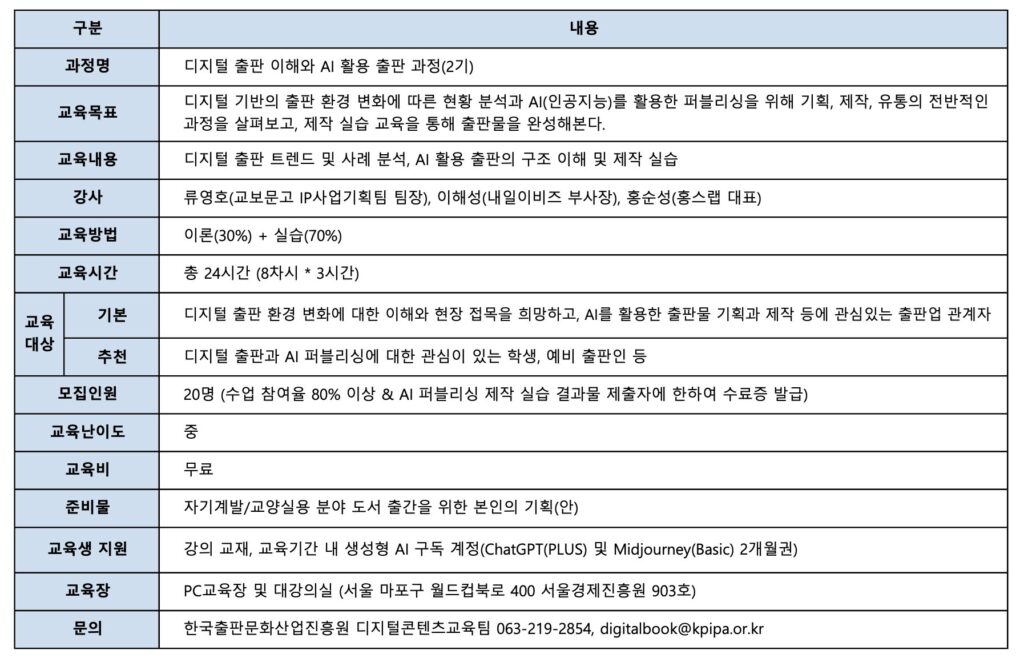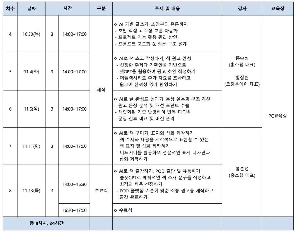 전 과정은 실무 중심으로 운영되었고, 참여자 대부분이 실제 ‘한 권의 책’을 완성하며 AI 기반 집필 역량을 갖추는 경험적 성장을 이루었다. 이 과정은 향후 출판 현장에서 AI를 어떻게 도입하고 운영 시스템을 어떻게 설계해야 하는지 보여주는 하나의 모델이 되었다.