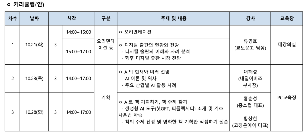 AI 퍼블리싱 과정은 디지털 출판 환경을 이해하는 이론 강의로 시작해, 생성형 AI로 책을 기획하고 초고를 작성하는 실습으로 이어지는 구조로 구성됐다. 각 회차는 하나의 흐름으로 연결되도록 설계했으며, 기획안 작성·초고 생산·자료 조사·문장 윤문·구조 개선 등 책 집필의 전 과정을 단계별로 경험하도록 했다. 이 흐름은 수강생이 실제 책 한 권의 완성 과정을 처음부터 끝까지 체험하도록 설계된 점이 특징이다.