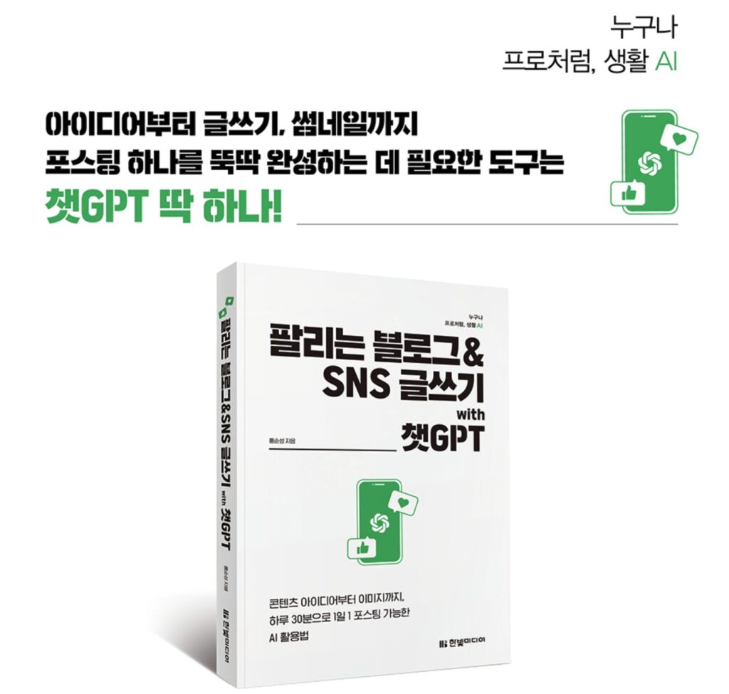 이 책은 글의 기획–초안–수정–완성–이미지 패키징까지 챗GPT 하나로 만드는 구조를 단계적으로 설명한다. 블로그·SNS 글쓰기부터 SEO 기반 글쓰기, 대표 이미지 생성, 문체 심기, 자동화 루틴 운영, 나만의 채널을 성장시키는 방법까지 실전 예제로 구성해 실제로 따라 하면 곧바로 적용할 수 있는 것이 특징이다. 단순한 글쓰기 도구를 넘어, 꾸준히 작성하는 시스템을 만들고 콘텐츠를 수익으로 연결하고자 하는 독자에게 이 책은 가장 효율적인 출발점이 된다.