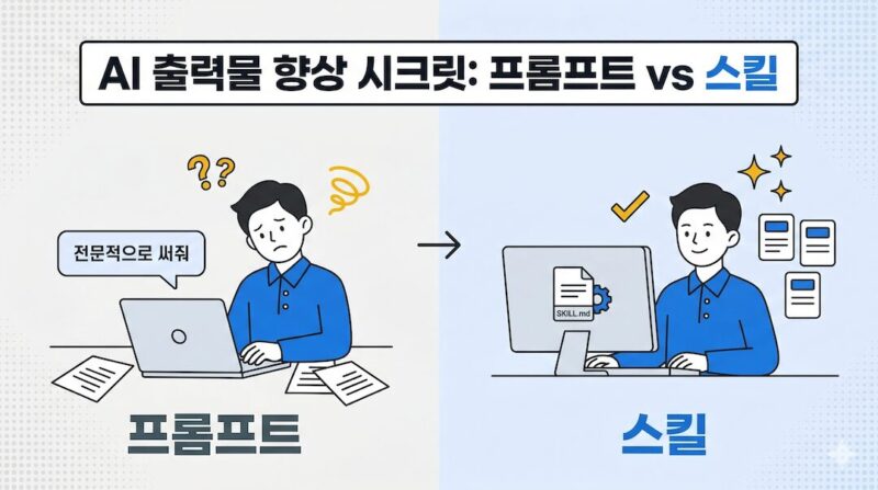 프롬프트와 스킬의 차이는 여기서 갈립니다. 프롬프트는 한 번의 요청을 위한 지시입니다. 대화가 끝나면 사라집니다. 스킬은 10년간 쌓은 작업 방식을 문서화한 매뉴얼입니다. 대화가 바뀌어도, 프로젝트가 달라져도 같은 기준이 유지됩니다. 경험이 파일이 되고, 파일이 시스템이 됩니다.