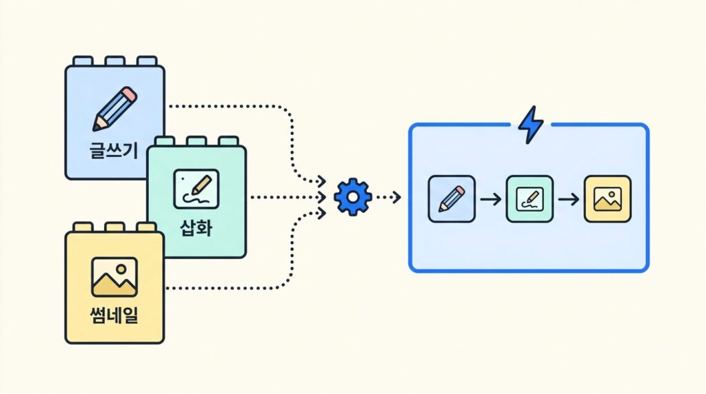 문제는 이 스킬들이 따로 동작한다는 점이었습니다. 글을 쓰고, 다시 삽화 프롬프트를 만들고, 또 썸네일 프롬프트를 만들고. 매번 각각 실행해야 했습니다. 클로드 코드에서는 이 스킬들을 하나로 연결할 수 있었습니다. 레고 블록을 조립하듯, 기존 스킬 3개를 순서대로 이어 붙여 하나의 통합 워크플로우를 만들었습니다.