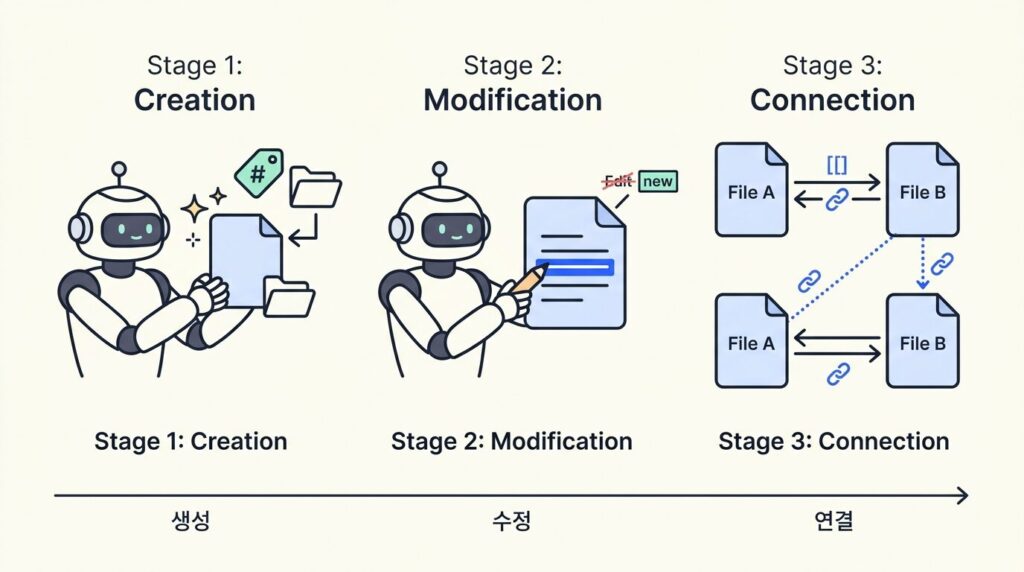 코워크가 옵시디언 볼트에 상시 접근하면, 세 가지 작업이 사람의 손을 떠납니다. 새 노트를 만들 때 폴더 배치와 태그 부여를 AI가 처리합니다. 기존 노트를 수정할 때 원본 파일을 직접 편집합니다. 노트 간 관계도 AI가 위키링크로 연결하고, 작업 진행 상황을 추적하는 문서를 자동으로 갱신합니다.